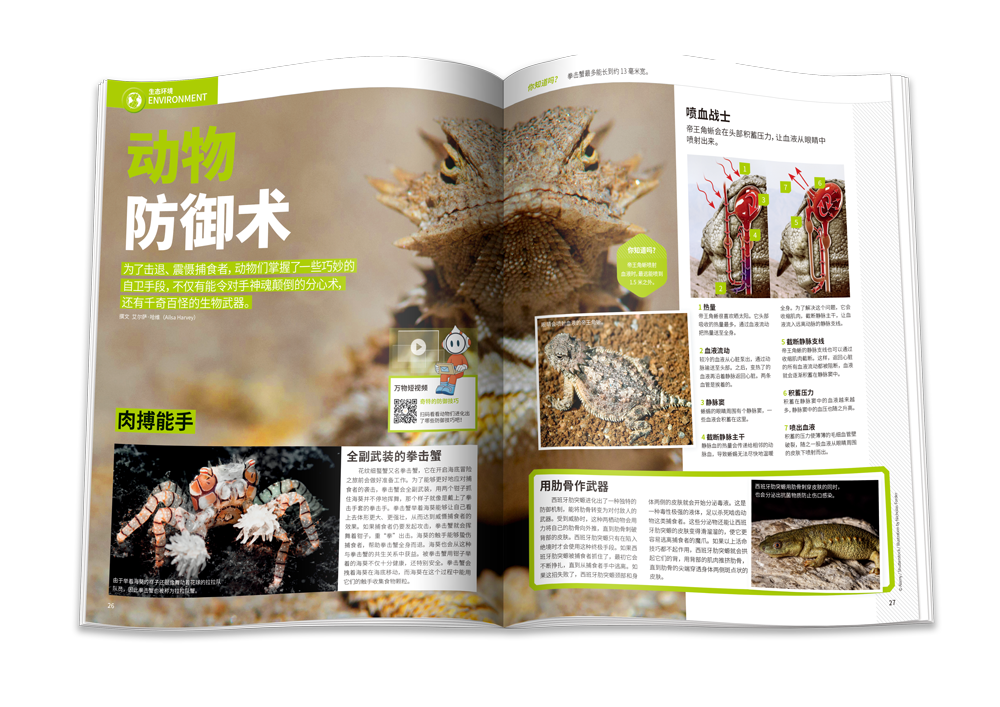 为了击退、震慑捕食者,动物们掌握了一些巧妙的自卫手段,不仅有能令对手神魂颠倒的分心术,还有千奇百怪的生物武器。