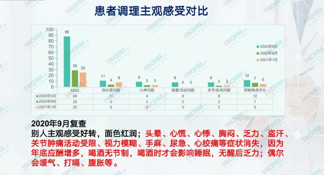 总结:通过这个患者的持续管理,我认为,慢性疲劳综合症这一严重困扰现代职场人的工作和生活的亚健康症状,我们是可以用功能医学的理论和思维模式去除病因,帮助患者还原他的生理失衡,从而缓解症状,重新恢复好的健康状态,提高生活和工作质量。