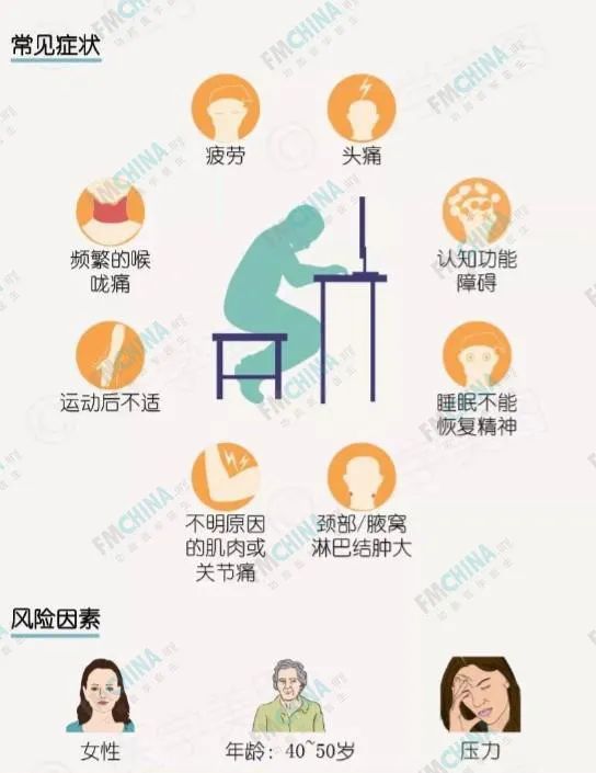 疲劳、头痛、认知功能障碍、睡眠无法恢复精神、颈部、腋窝淋巴结的肿大,不明原因的肌肉或关节痛、运动后不适,出现频繁的咽喉痛(见图1)。