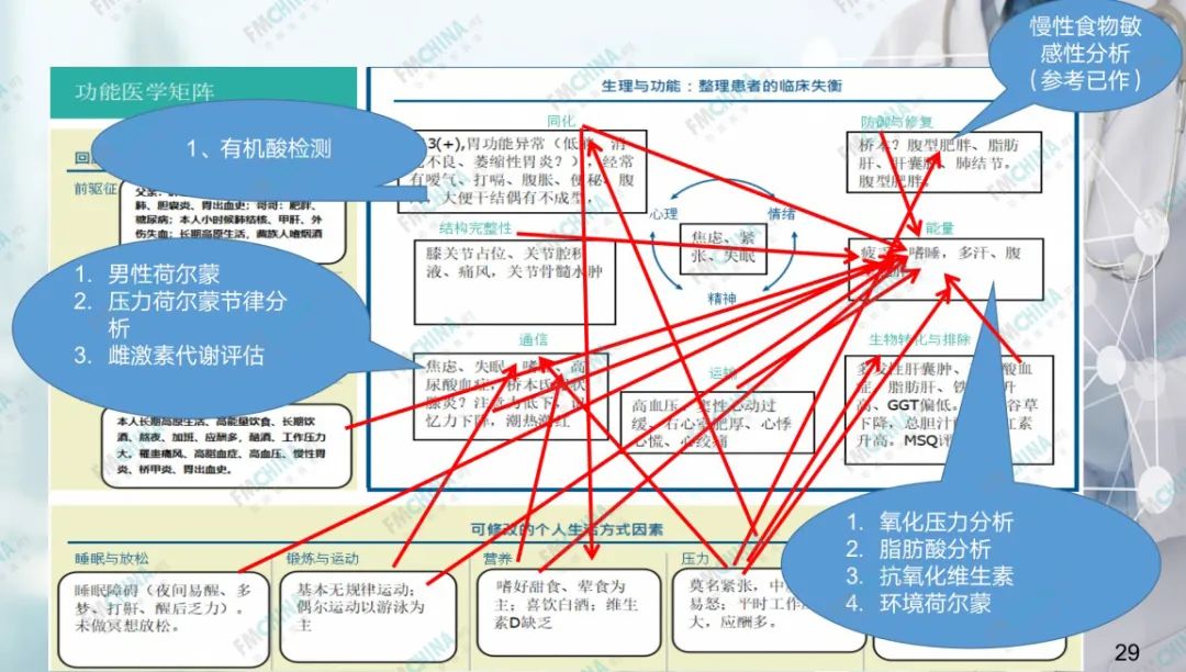 对于复杂发病机制还未到病理性改变的时,发病率高,疾病复杂、严重地影响了身体健康状况,并且很有可能从疲劳逐渐发展成慢病。首先需要转变临床思维,追根溯源,找到原因,才能进行个性化的精准干预。在所有的慢性疲劳综合征的发病机制中,功能医学在每一个发病机制都有相关生理失衡的检测,这些检测是用来做定量和定性的去分析。