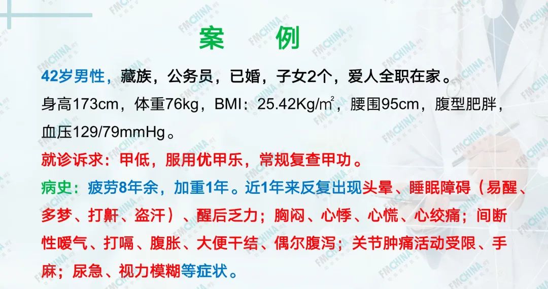 患者就诊自述为因长期甲状腺功能低下,服用优甲乐。观察发现患者眉头紧锁、面色不佳、精神状态焦虑。通过问诊得知其疲劳八年余后加重一年。同时近一年来,患者反复出现头晕、睡眠障碍、夜眠易惊醒、多梦、打鼾、盗汗。醒后自觉乏力、胸闷、心悸、心慌、心绞痛、间断性嗳气、打嗝、腹胀、大便干结,偶发腹泻、关节肿痛、活动受限、手麻、尿急、视力模糊。
