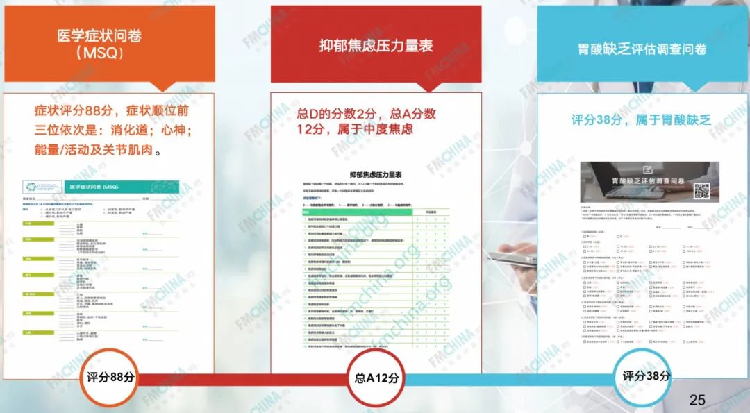 通过前期的问诊和临床异常指标的整理,让患者自身对其健康状况有了初步了解;接下来,给患者做了MSQ医学诊断问卷、抑郁焦虑压力量表测试、胃酸缺乏评估发现其体内的毒素超标、中度焦虑、胃酸分泌不足(见图6)。