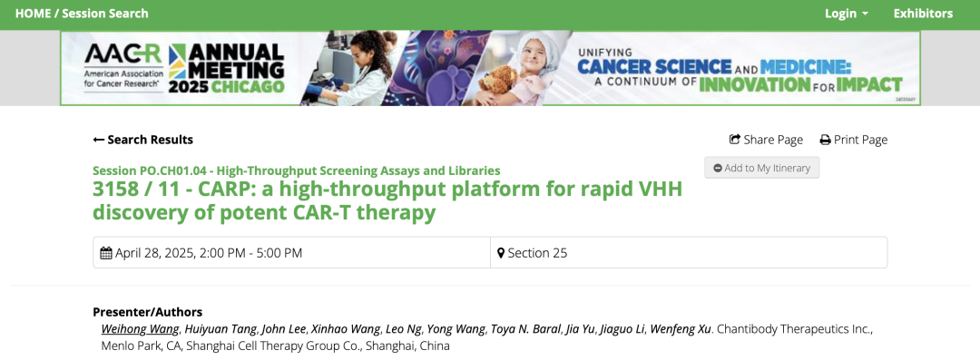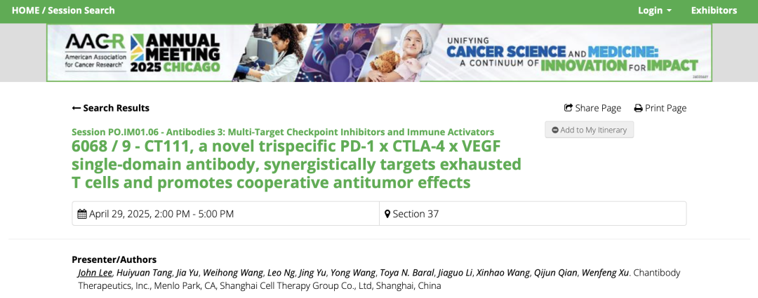 2025年4月25日-4月30日,第116届美国癌症研究协会(AACR)年会将于在美国芝加哥召开,AACR年会是发布癌症诊疗研究进展信息的重要国际学术会议。上海细胞治疗集团5项自主研发的最新研究成果入选2025年AACR年会并获邀会议现场展示。其中包含与上海大学附属孟超肿瘤医院联合开展的2项创新CAR-T细胞治疗产品研究:自分泌PD1纳米抗体装甲化双靶点CAR-T项目(BZE2203)和非病毒三靶点无培养闪CAR-T项目(BZE2204);以及与其子公司美国Chantibody公司(CHANTIBODY THERAPEUTICS INC.)合作进行的3项基于纳米抗体技术的创新药物研究项目:PD-1*CTLA-4*VEGF三靶点特异性纳米抗体(CT111)、CD3及肿瘤特异性靶点的TCE抗体(CT224)和基于人工智能的VHH高通量筛选平台项目(CARP)。