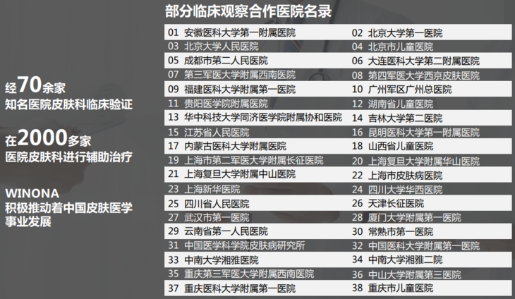 北京大学第一医院、复旦大学华山医院等54家国内优秀三甲医院,一致通过了对薇诺娜产品功效性和安全性的临床观察;
