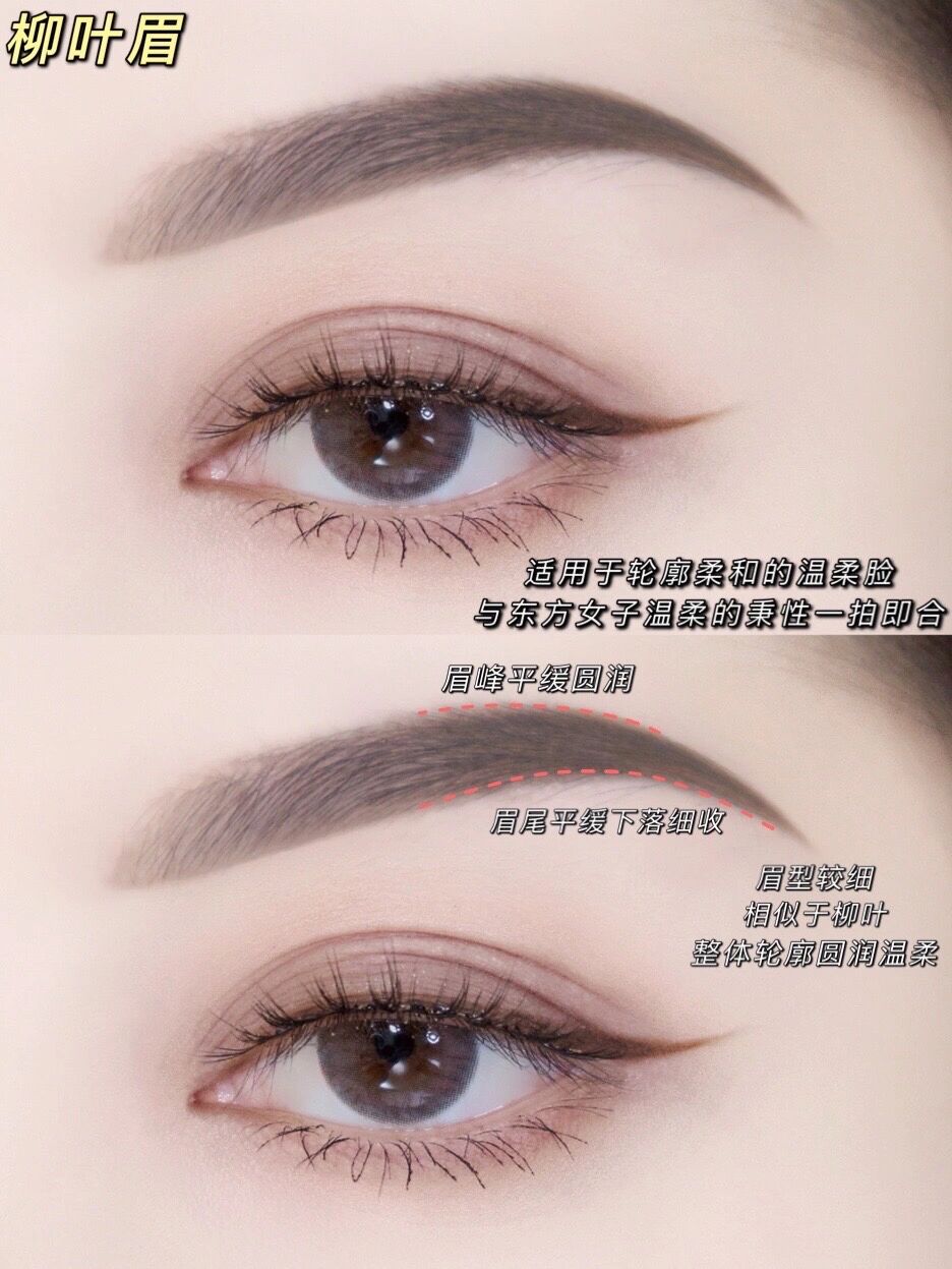 适用于轮廓柔和、面部骨骼感弱的温柔脸。该眉形形似柳叶,细长温婉,整体轮廓较为圆润,东方女子妆容中较为常见。
