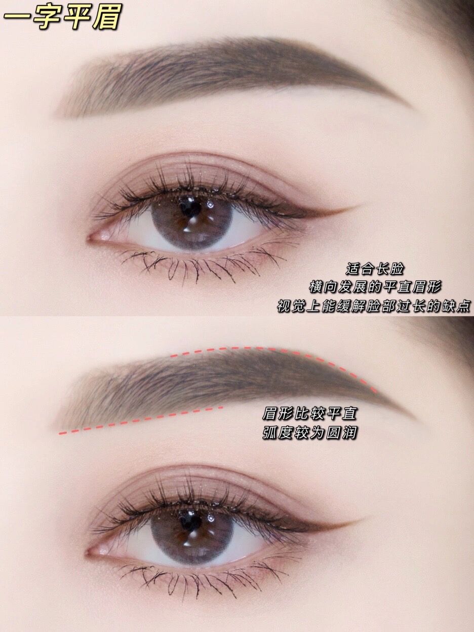 适合长脸,该眉形弧度圆润走向平直,视觉上横向发展的眉形走向能帮助我们缓解脸部过长的缺点。