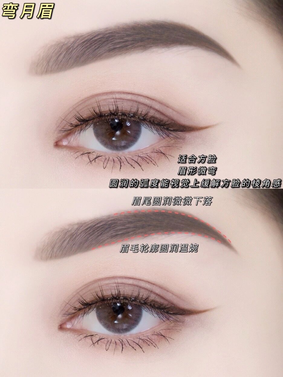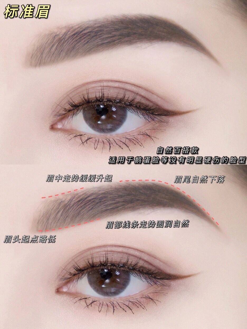 自然百搭款,适用于类似于鹅蛋脸的没有明显硬伤的脸型。如果不知道画哪种眉形,建议先从标准眉练起。该眉形眉部线条圆润自然,日常画实用不出错。
