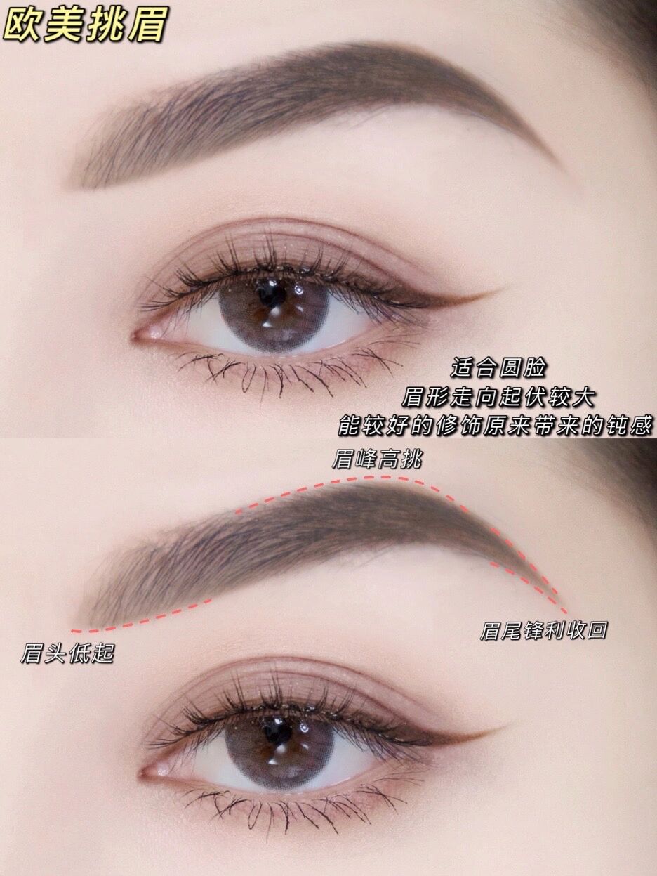 适合圆脸,该眉形眉形走向起伏较大,视觉上能帮助我们较好的修饰圆脸带来的钝感。