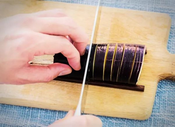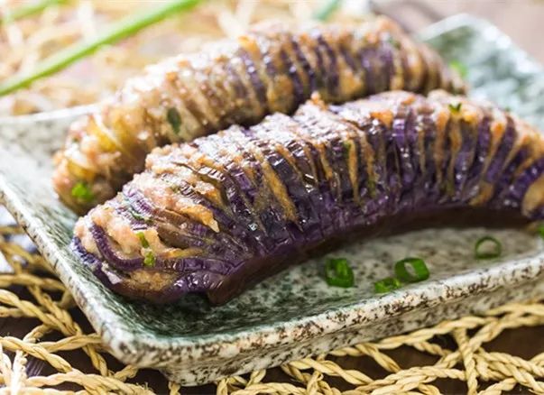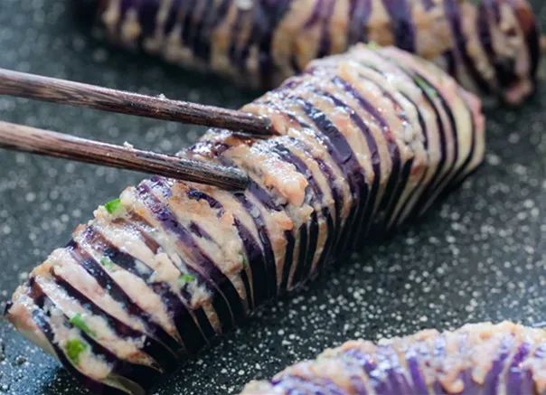 紫皮粗茄一整根,夹刀薄切酿肉馅,