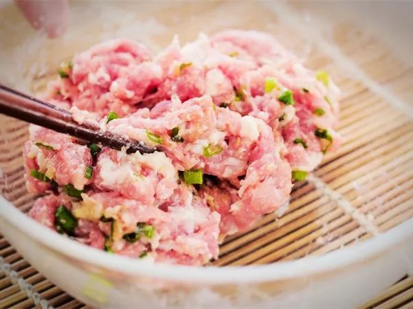 3 、将肉馅剁好,放1勺料酒,1勺酱油,1小捏盐,1大捏花椒面,2顆葱花末,1/3勺姜末搅匀后备用;