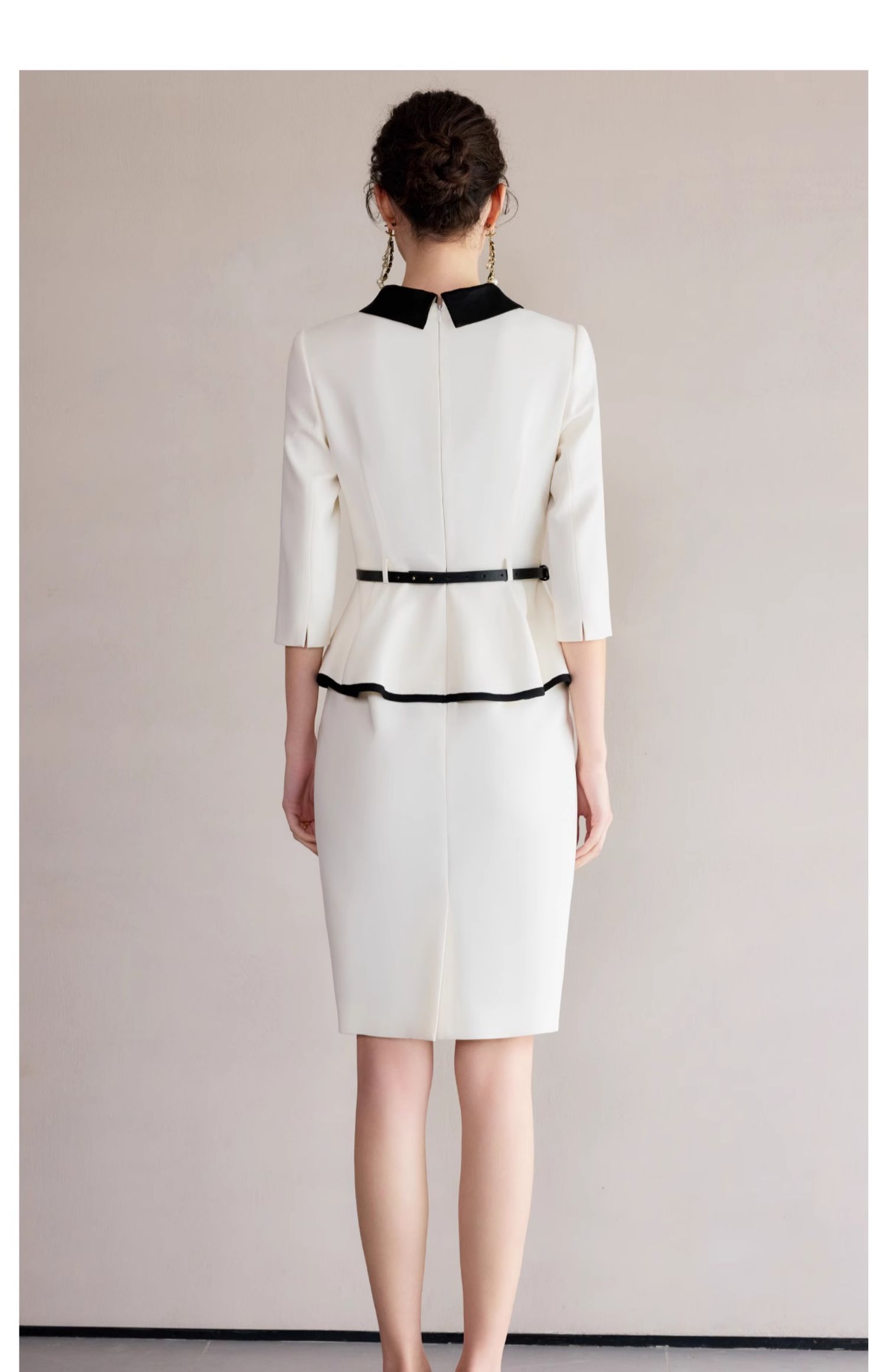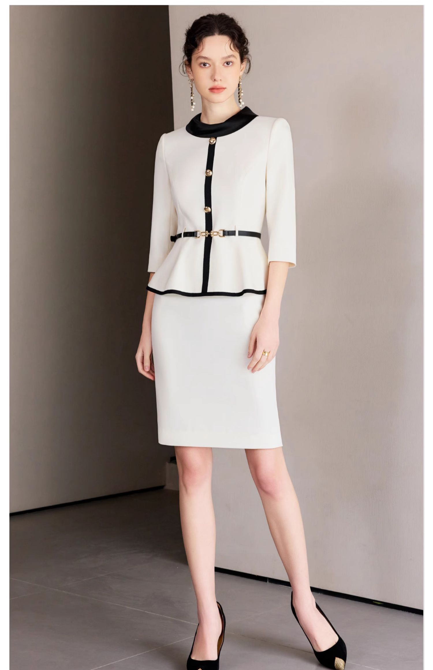连衣裙上装是设计感小外套,黑白配色经典又高级,领口和下摆的黑色镶边,像给干练加了层精致滤镜,七分袖藏起小肉肉,行动也超利落,同色系包臀裙,勾勒利落线条,走路带风又不失女人味👠