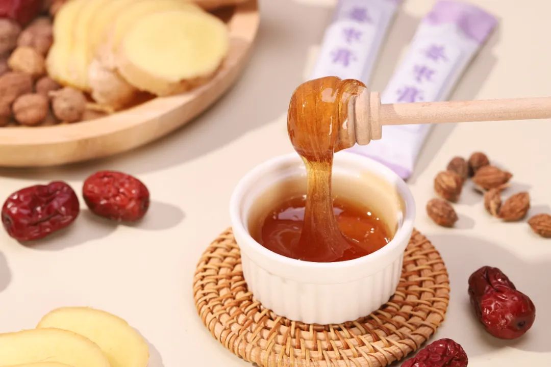 蜂蜜甜甜的,能够中和生姜的辛味,宝宝喝起来更舒服。事实上,姜枣膏的生姜味道不浓郁,刚入口时,基本上是蜂蜜、饴糖和大枣带来的回甜味。只有在最后入喉的时候,才会返还一丝生姜的辛味。