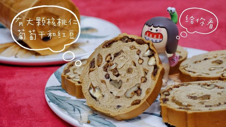 配料:面粉,全麦粉,新鲜牛奶,鸡蛋,核桃仁,葡萄干,红豆,黄油,白砂糖,酵母,盐。