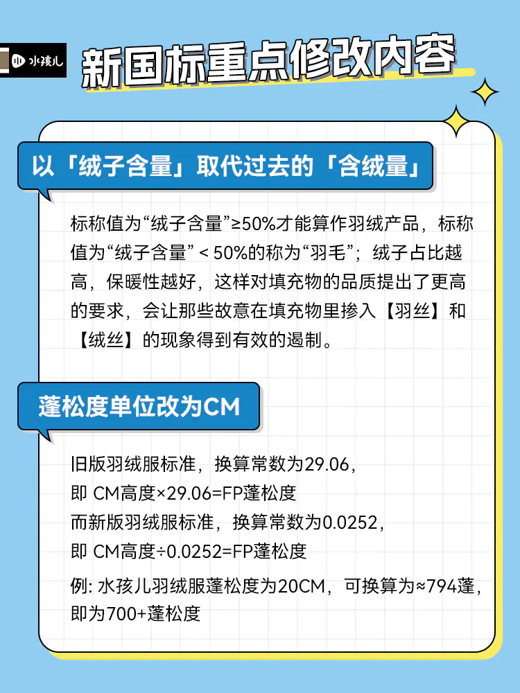 而新版羽绒服标准,换算常数为0.0252,即 cm高度÷0.0252=FP蓬松度