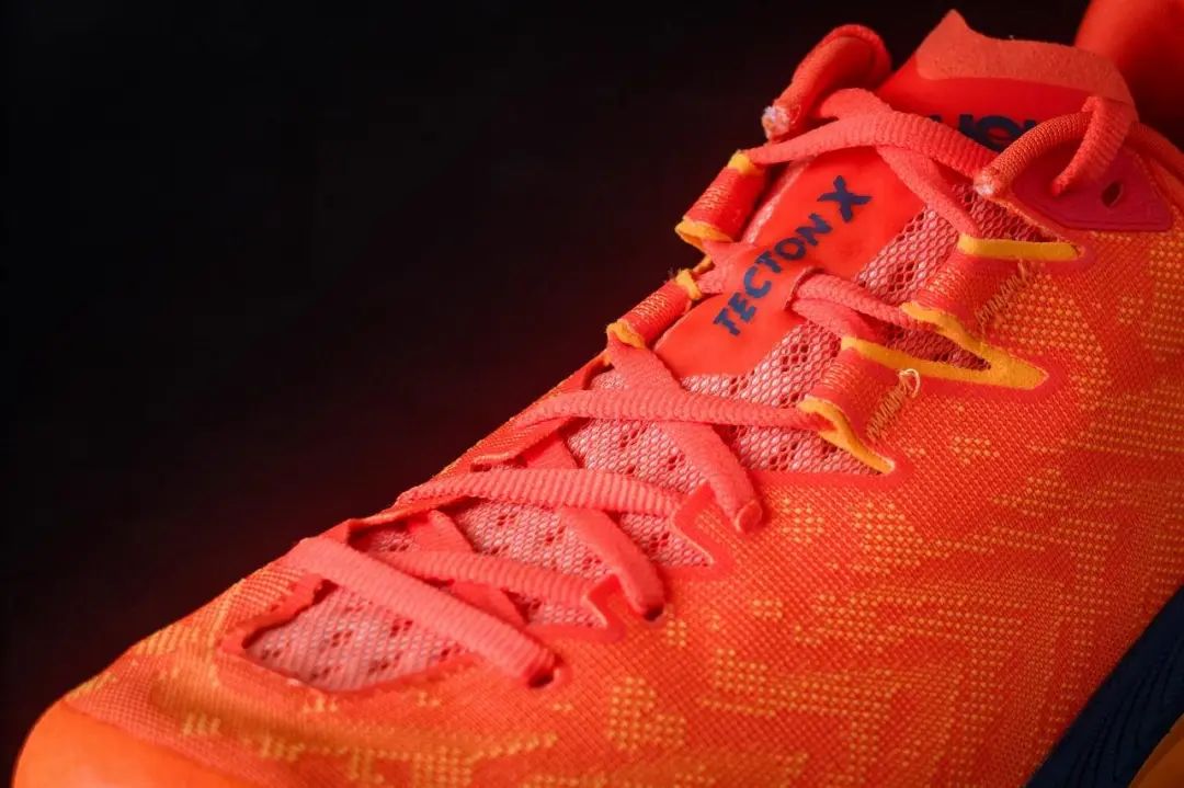 为了轻量化和速干透气,TECTON X为单层提花编织鞋面,鞋身只有鞋头防踢压胶用于保护脚趾,脚背部分鞋带环设计可以承受更大的收紧力量,为脚背提供更好的包裹性能。