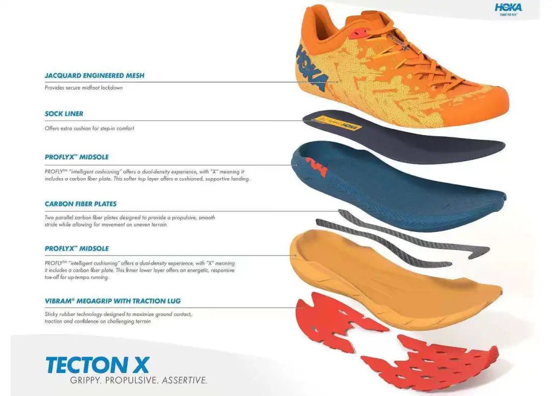 HokaOneOne新推出的TECTON X (钛氪动X)碳板越野跑鞋以一套全新的碳板概念来解决了这个难题。