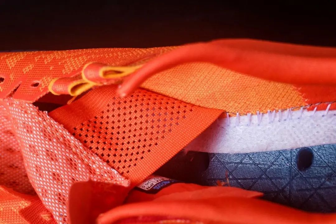 鞋舌为网布+菱形冲孔缓冲垫的搭配并延伸至鞋头,透气性MAX,鞋仓内使用弹力网布将鞋舌两侧固定,提升包裹感的同时避免出现鞋舌跑歪的情况,可以看到TECTON X为了轻量化连中底布都进行了缩减。