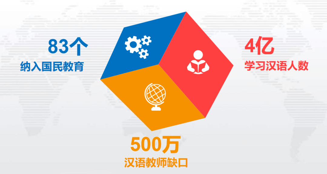 随着国家倡议,汉语热席卷全球。全球已有180多个国家和地区开展中文教育,70个国家将汉语教学纳入国民教育体系。超过4000所大学和30000所中小学开设了中文课程,学习汉语的人数近2亿。