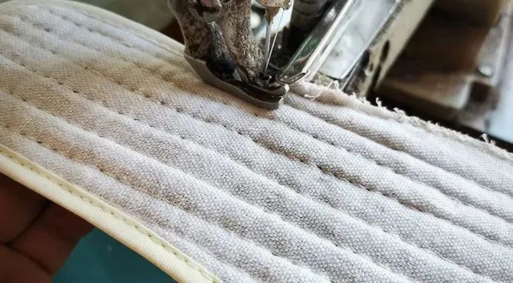 精准车线丨每片鞋垫要手工车8道线,同时确保线与线的间距足够小,才能牢牢锁住艾绒,走路不跑绒。