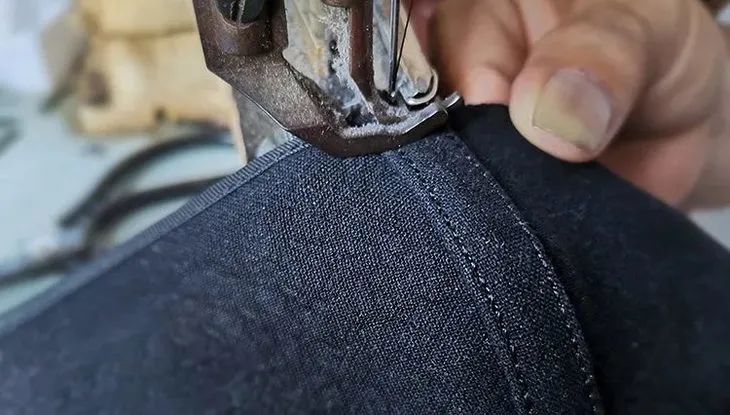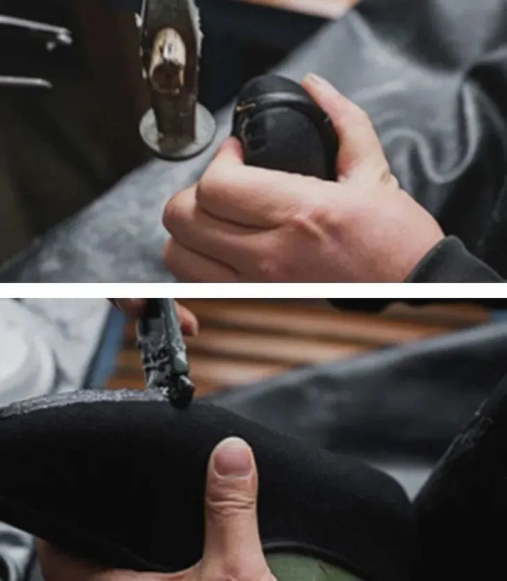 制作鞋帮丨每一双鞋都是手工裁剪,需经过画料、剪料、合缝、分缝等十多个步骤,只有经验老道的匠人,才能至始至终保持鞋面规整不变形。