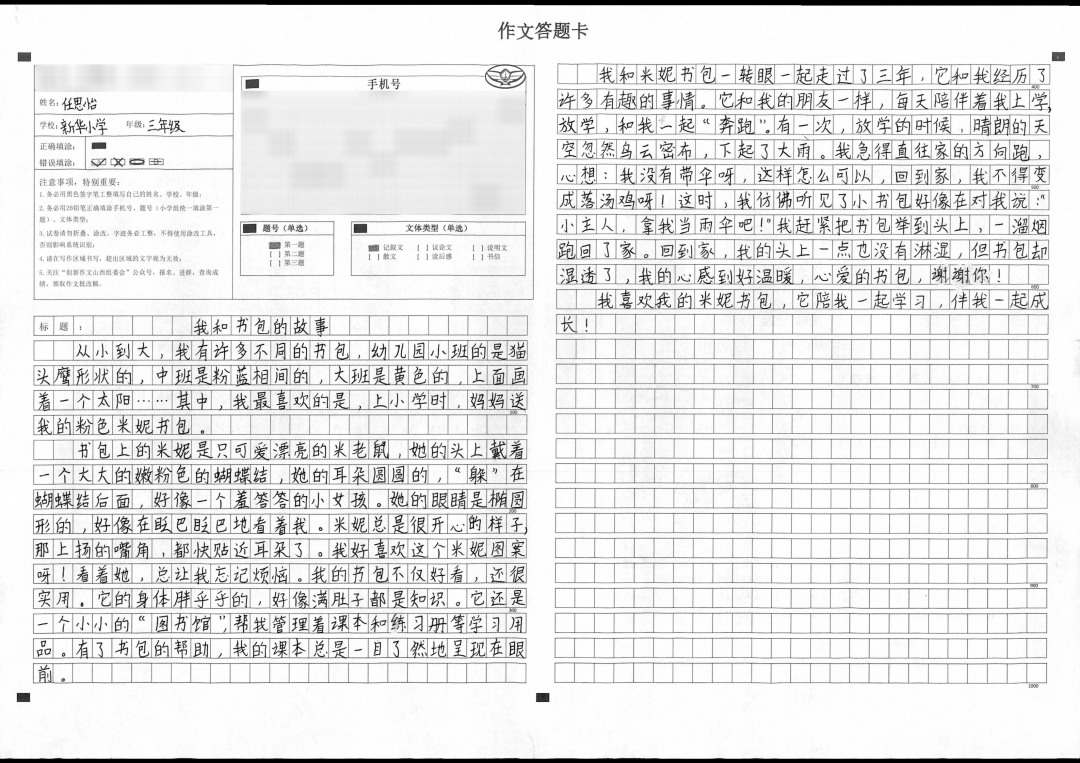 最后是成文。开头开门见山,以时间为序描述从上幼儿园到小学,用过的各种各样的书包,点明最喜欢米妮书包,引起下文。