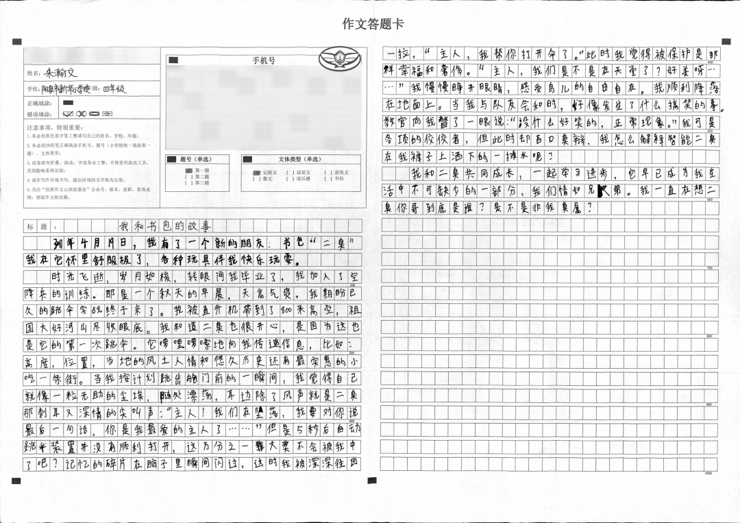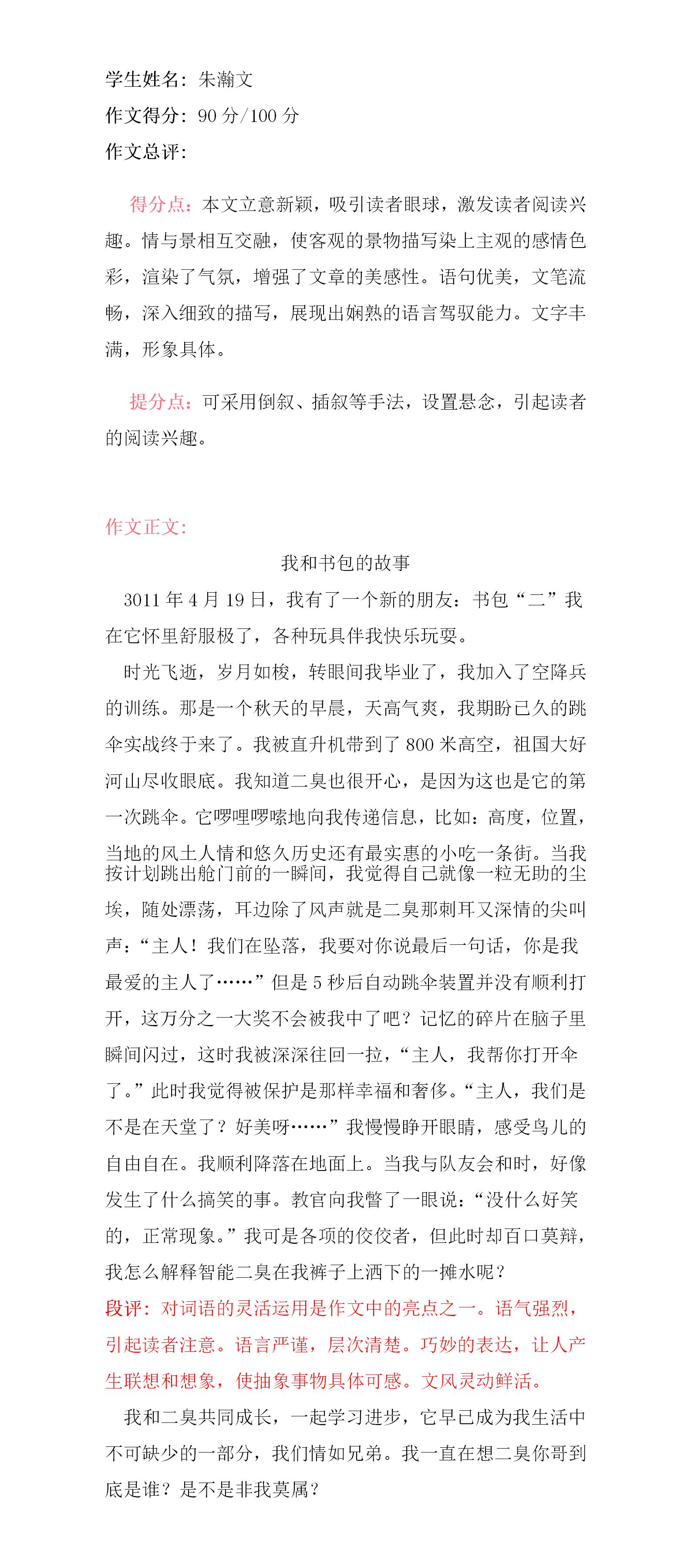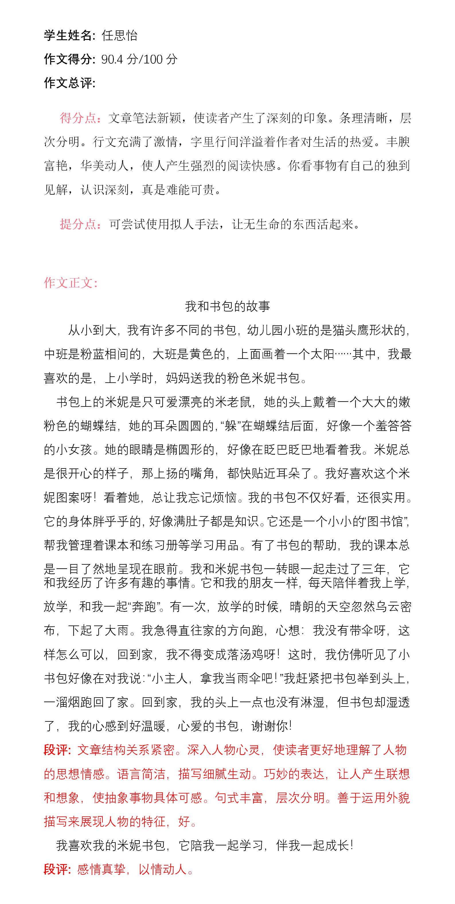 孩子,你可以通过文字展示你的才华。想象奇妙,将日常生活所见的书包作为你文章的主体,构思新奇。语言流畅自然,仿佛是一气呵成。希望你可以加强日常积累,善于观察,继续努力。