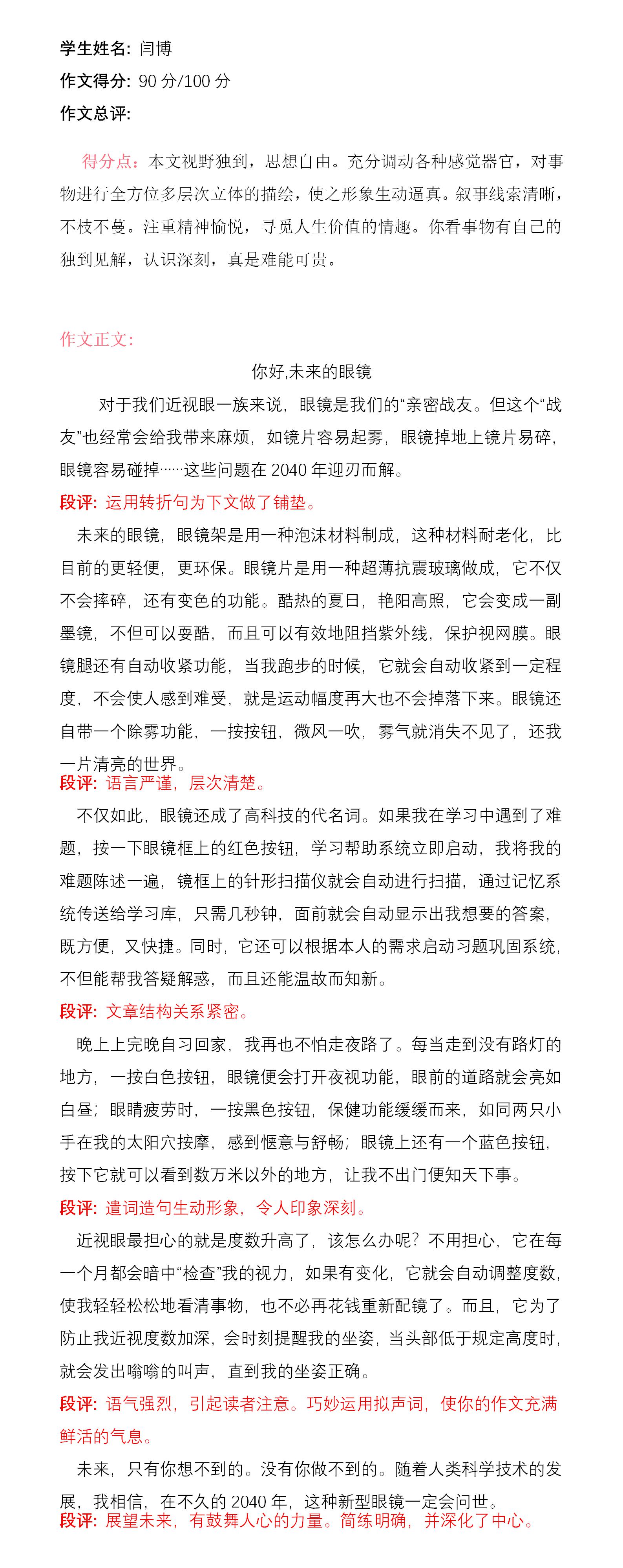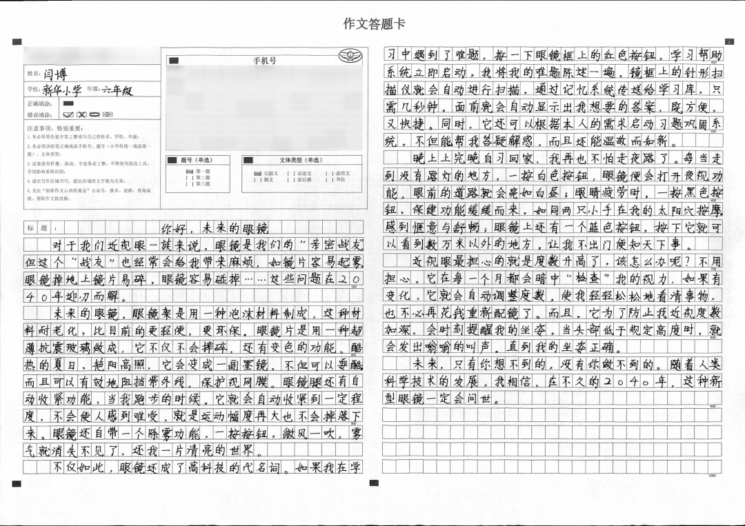 我是一个近视眼,眼镜给我带来了诸多不便,所以我一直想要一个高科技的眼镜,它不仅能解决我戴眼镜的许多难题,还能给我和许多人带来更多的便利。这篇作文就是我心目中向往的眼镜,我从眼镜的材质、结构入手,改进眼镜本身的不足,同时又添加了许多新功能,增强了眼镜的科技感。