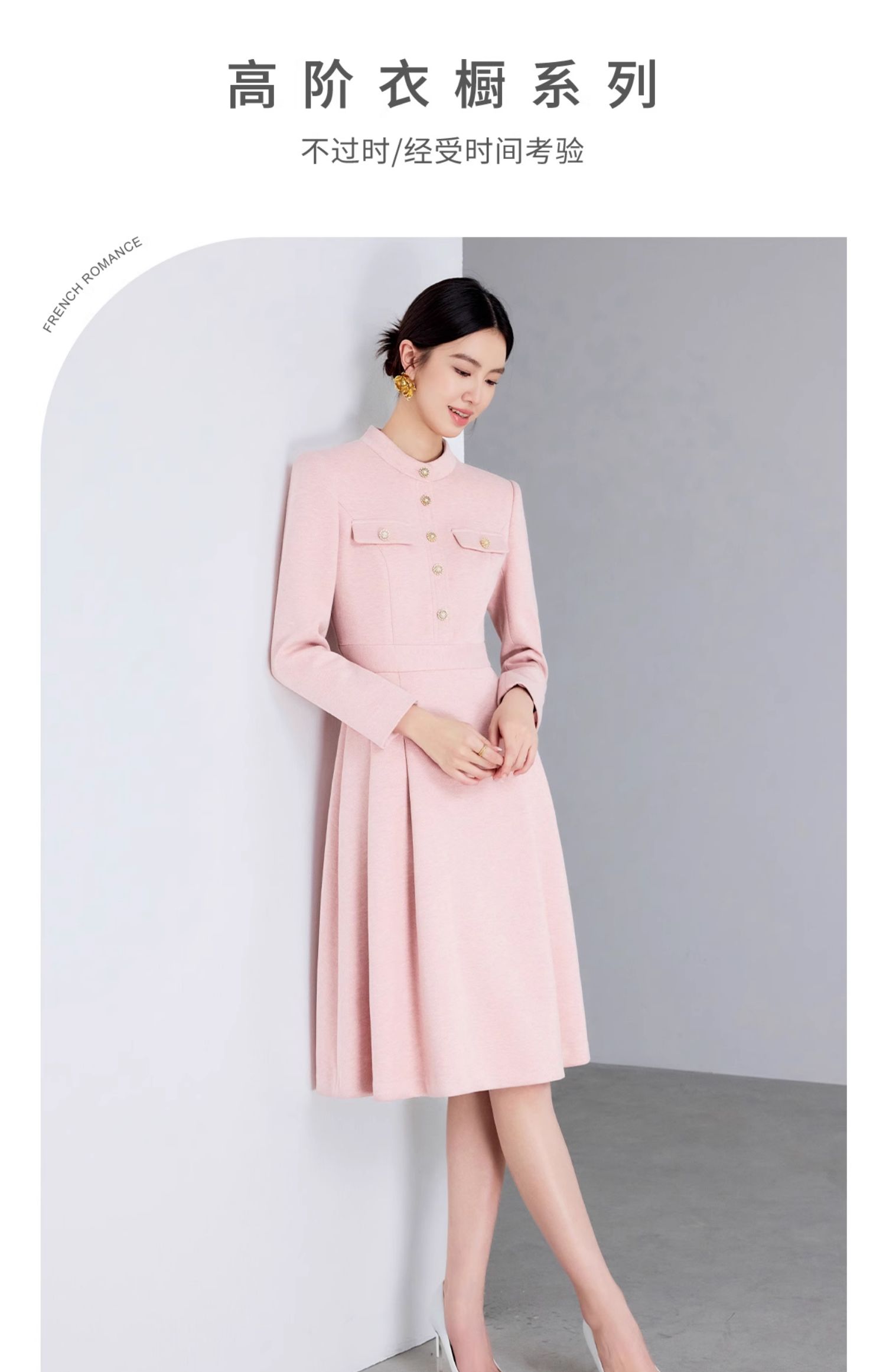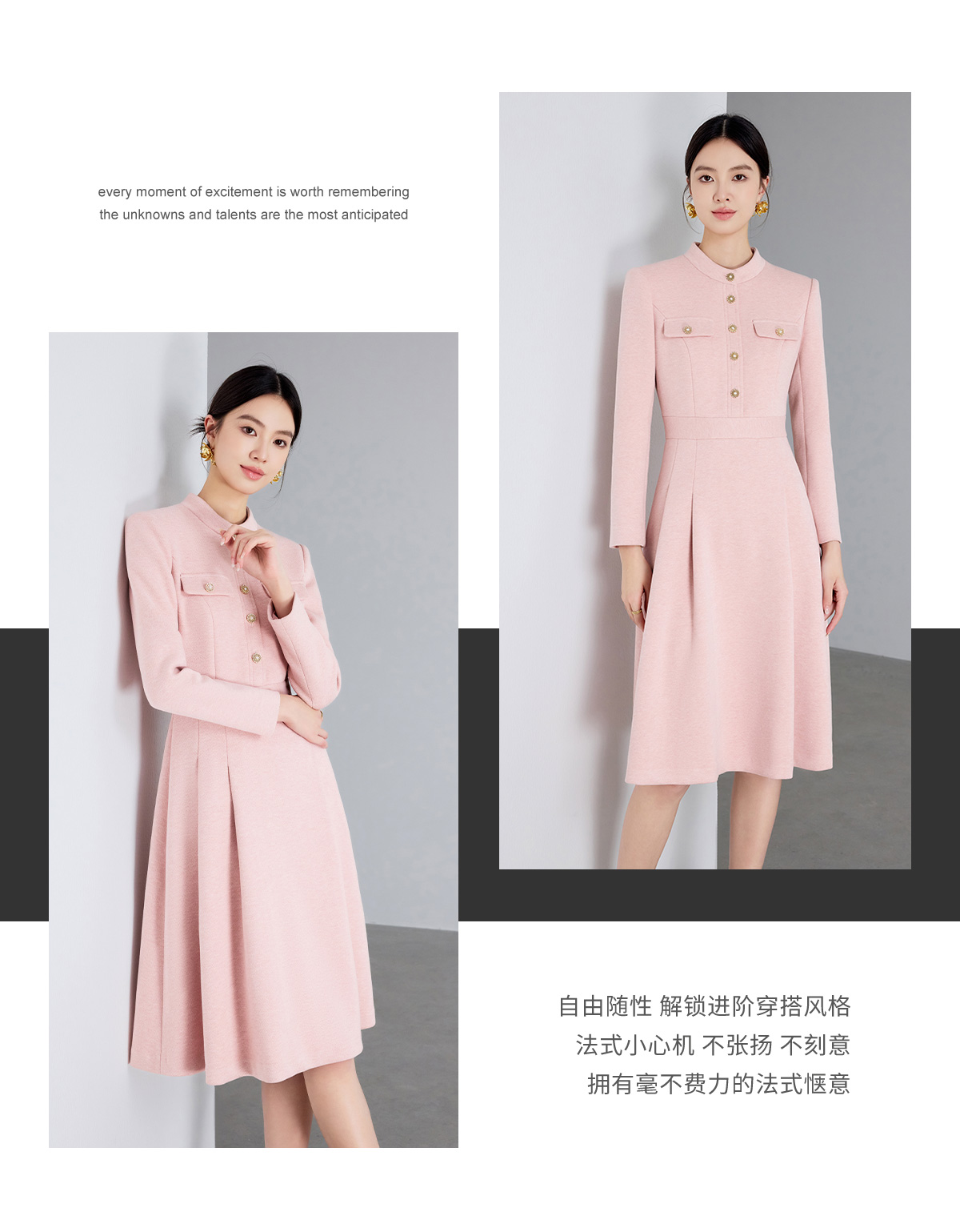 立领设计端庄大气,单排扣与对称口袋的细节,将职场的专业感巧妙融入其中。收腰剪裁精准贴合身形,大摆裙的弧度则为整体造型增添了几分灵动,刚柔并济的设计,把女性的多面魅力展现得淋漓尽致。