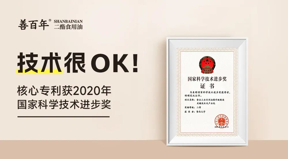 善百年二酯油由暨南大学善百年先端食品联合研究院研制,团队在健康油脂方面的研究已有 21 年,采用更安全的绿色生物酶法制备,比国际上原始的化学制备法更先进,二酯油核心专利也因此获得2020国家科学技术进步奖,对中国甘油二酯发展具有里程碑意义。