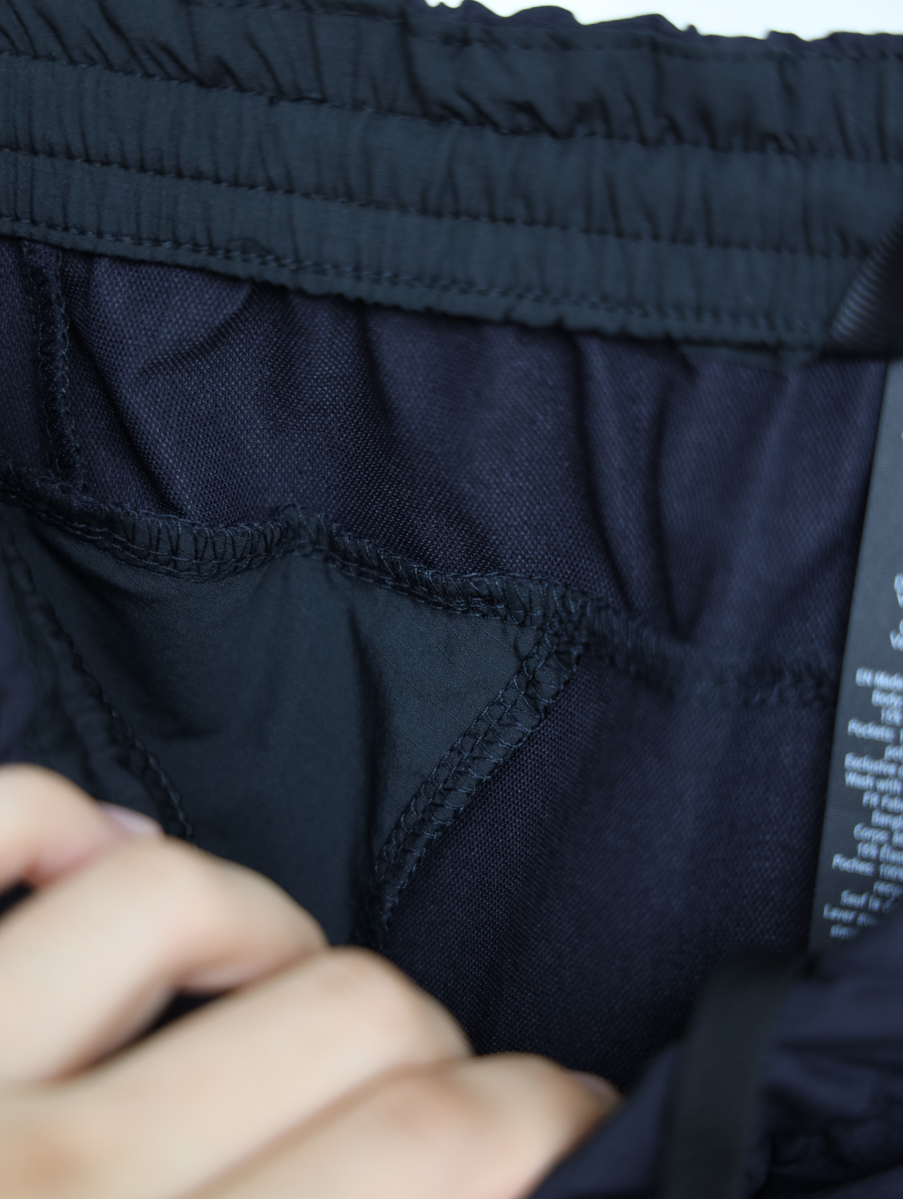 腰部松紧设计,带隐藏式抽绳,卷起裤脚可见反光细节设计,宽松收腿版型