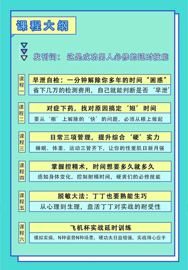 这套课程包含详细的早谢自检以及关于健康、睡眠、运动搭配的内容,涵盖了关于男性早谢关心的各个要点,让你在家就能自检出自己是否真的早谢!