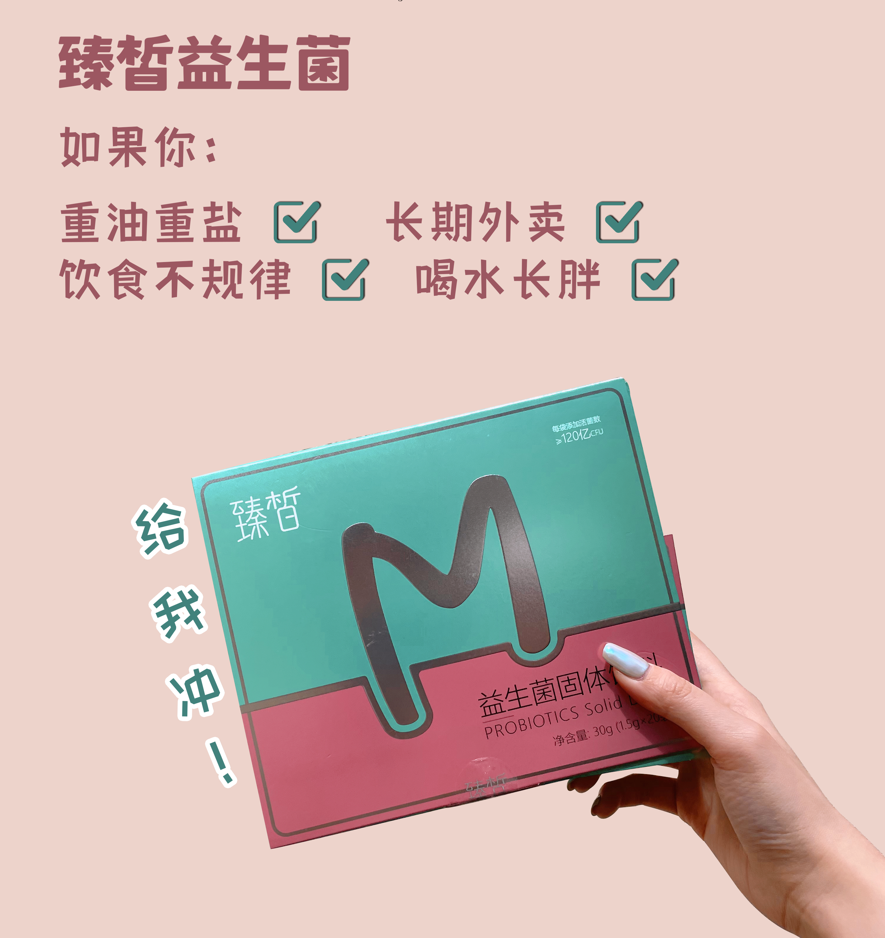 就是这样一袋超级营养的益生菌,让你一口吃下≥120亿活的益生菌!每天出门往包里扔2袋,外套兜里也能轻松放下!答应我,就做那个干吃不胖,让身边所有人羡慕的女孩吧!