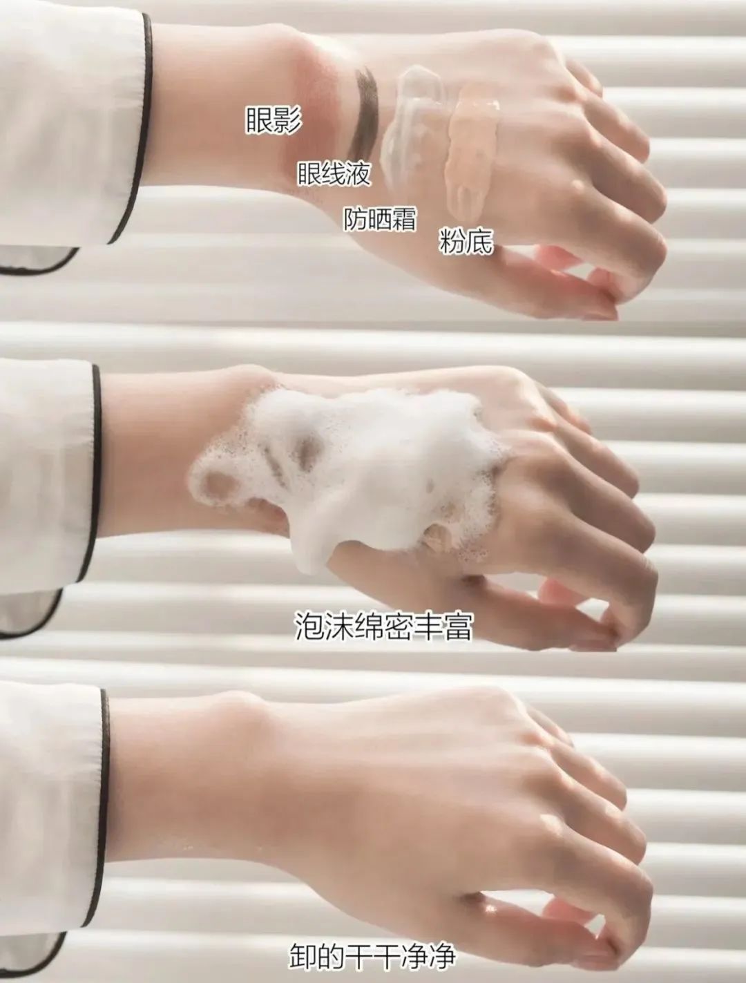 日常简单的隔离、眼影口红之类的彩妆,都能轻松洗掉,不需要使用专门的卸妆产品,用它洗完就已经卸的很干净了。