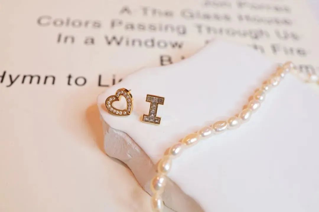 字母I足足镶满9颗钻石,另一半爱心则是立体珍珠,整体别具一格,少女中不失温婉可人~