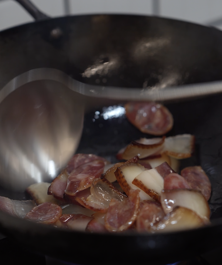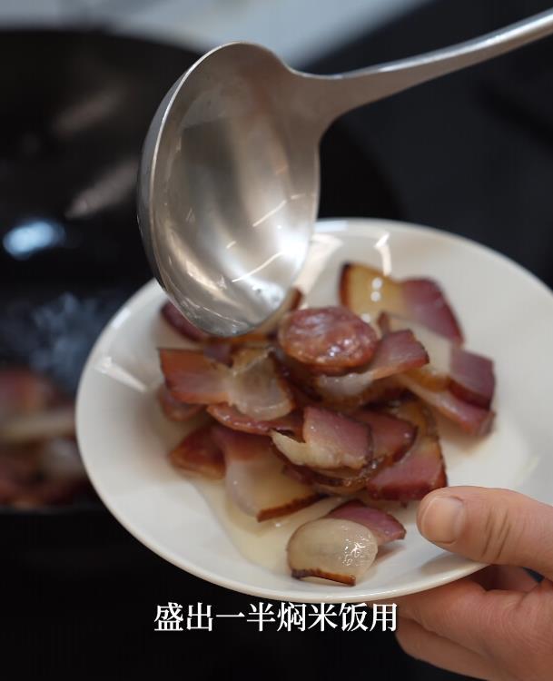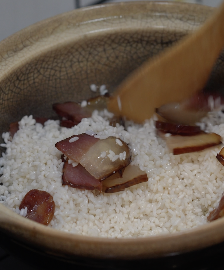 砂锅小火热锅,加适量香油,将泡好的米下锅,加入腊肉和腊肠翻炒