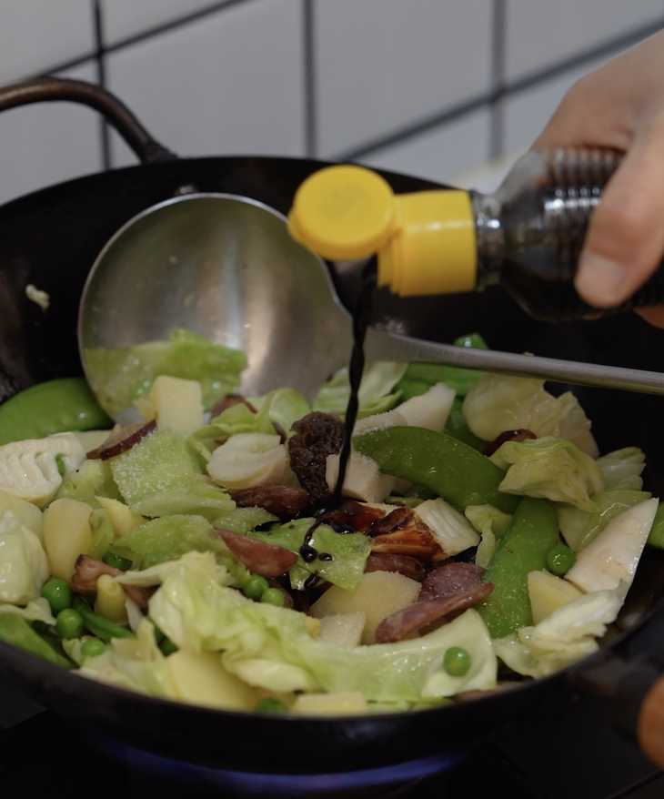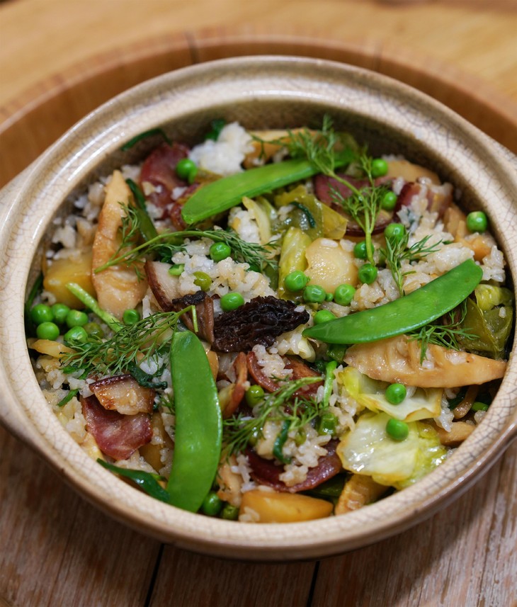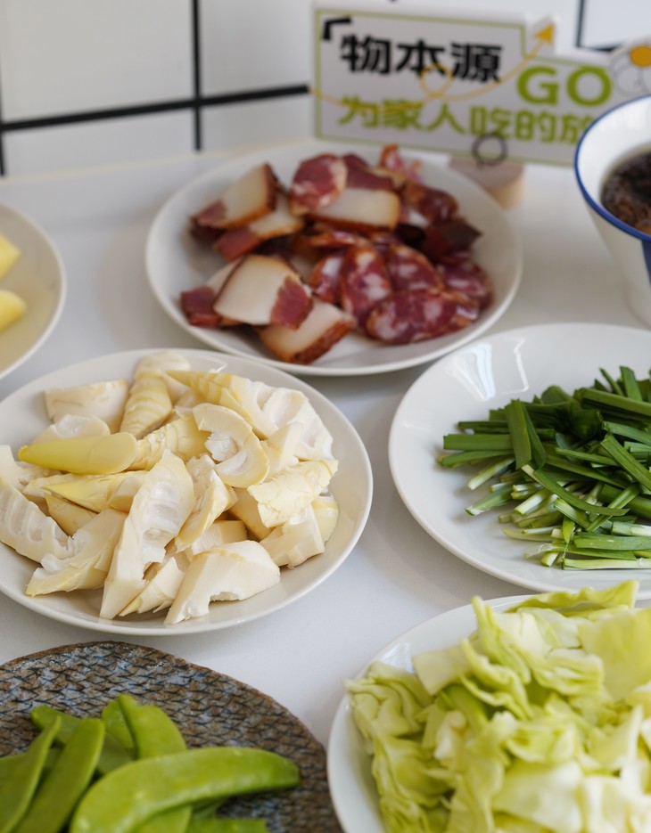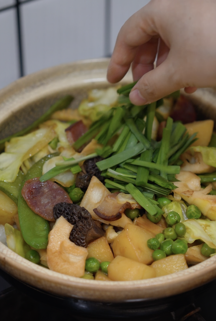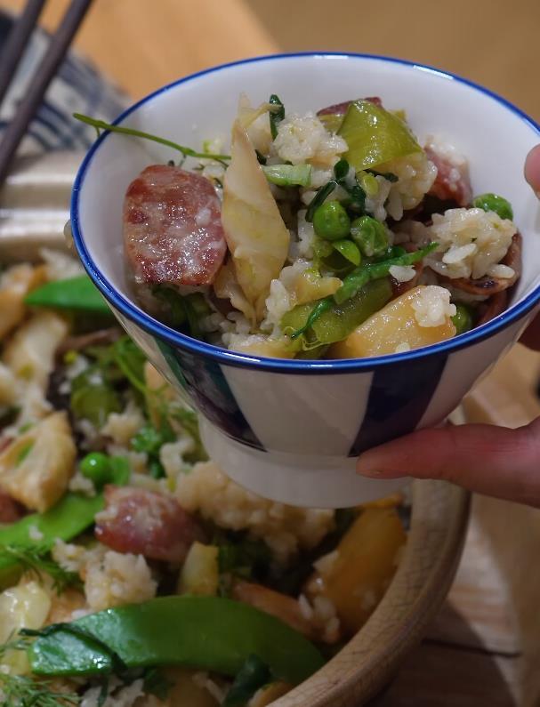 春笋、腊肉肠、豌豆、土豆、荷兰豆、卷心菜等,造就了一碗香喷喷的冬去春来饭。