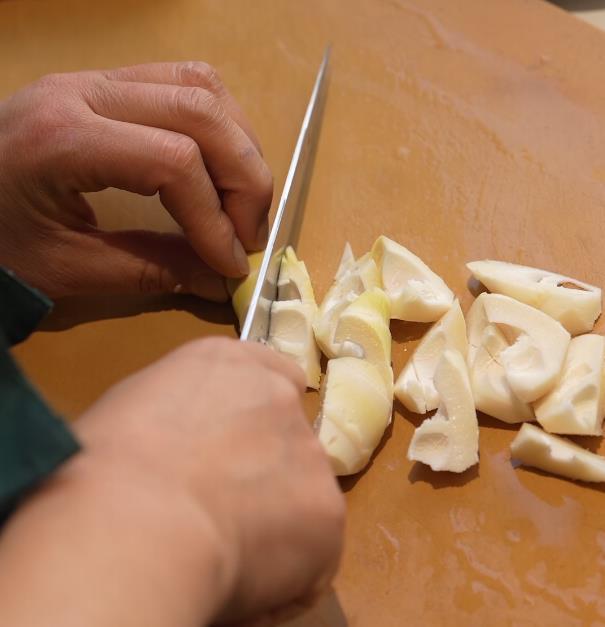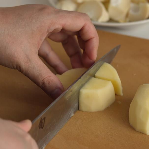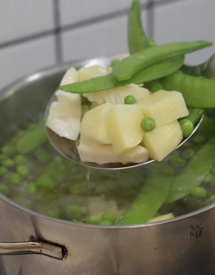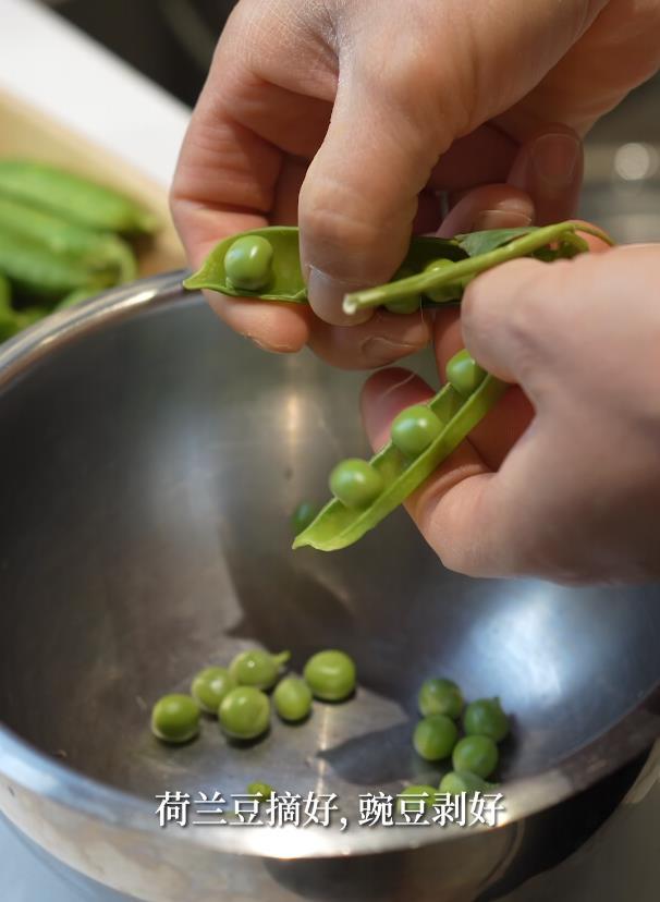 土豆焯水5分钟、笋3分钟,荷兰豆和豌豆最后放