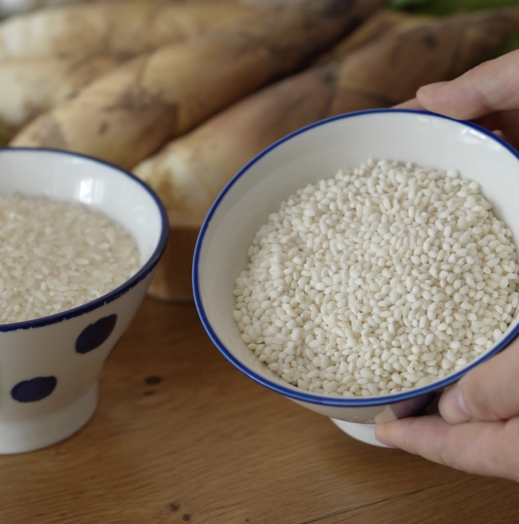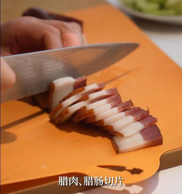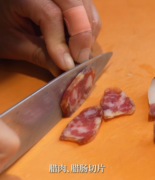 临安天目山春笋300g、糯米100g、五常大米100g、腊肉100g、腊肠100g、包菜半颗、 青豌豆适量、土豆1个、韭菜适量、 荷兰豆适量、猪油适量、盐适量、酱油适量。