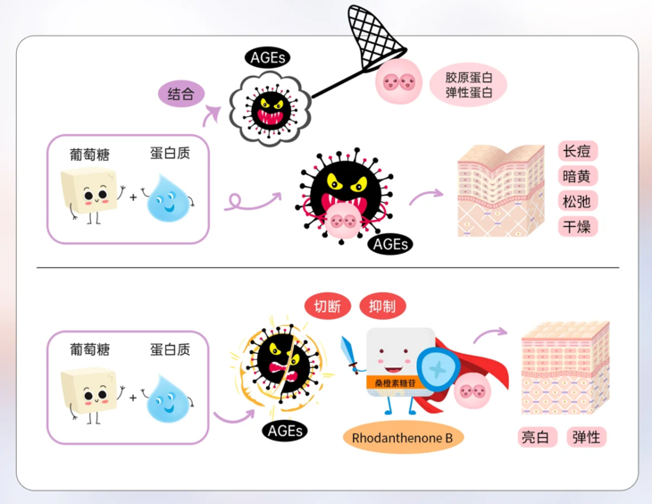 ——多余的糖分会黏附在胶原蛋白上,形成糖化垃圾,让肌肤失去弹性、变硬变脆,皱纹加深、毛孔粗大、皮肤松弛下垂