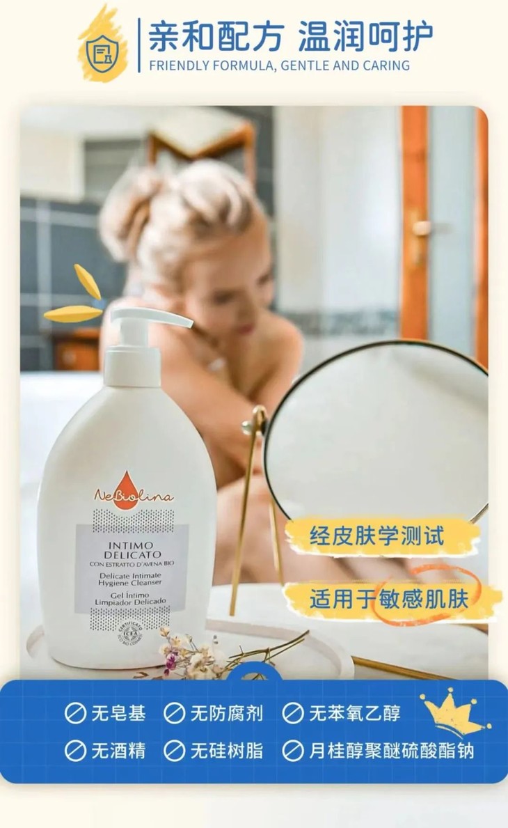 弱酸性配方接近私处的PH值,益生元胶体燕麦可以保护我们私处的有益菌,抵抗炎症菌。