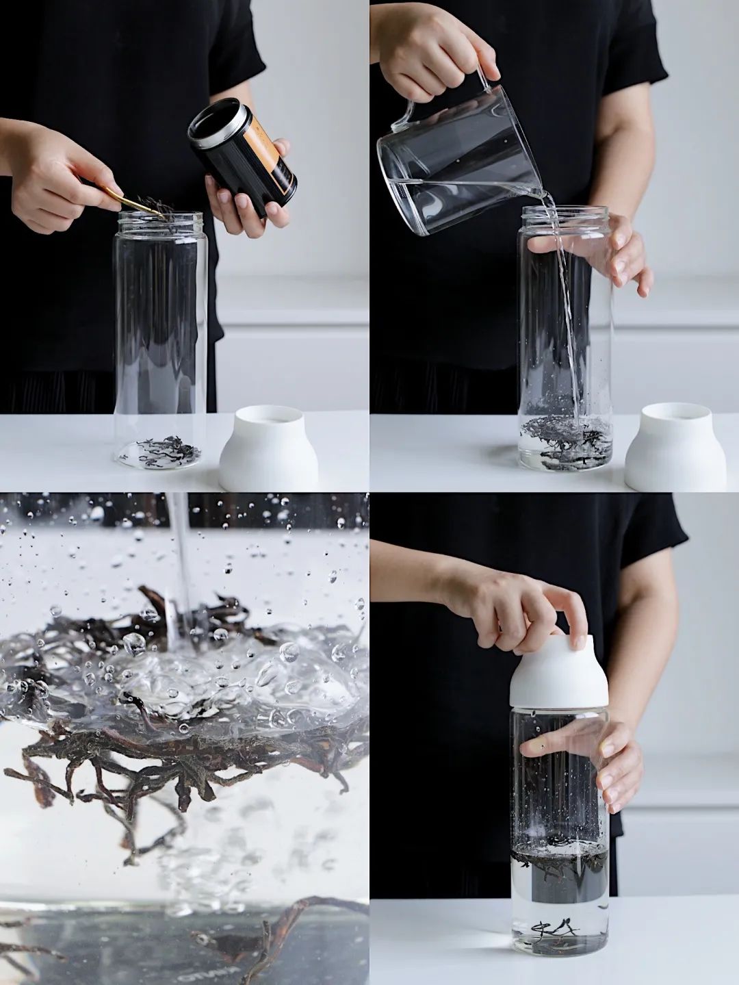 ① 提前冷萃好乌龙茶:准备一个干净的冷泡壶倒入蜜兰香单丛乌龙茶,倒入纯净水,茶叶与水的比例为1:80-100,盖好上盖,放入冰箱冷藏6-8小时。