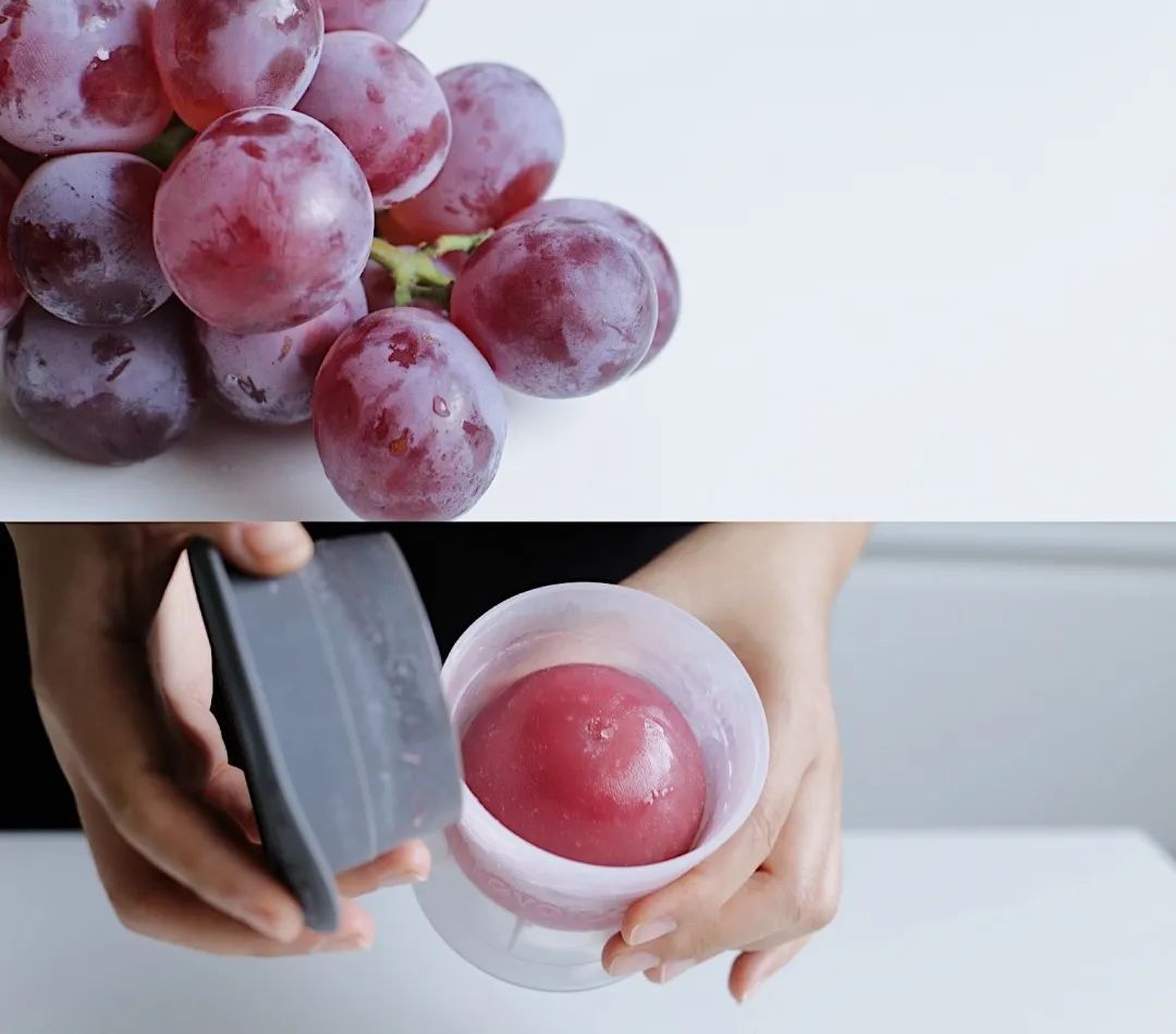 ② 提前冷冻葡萄冰:红提榨汁,过滤掉果肉将果汁倒入冰球模具进行冷冻。