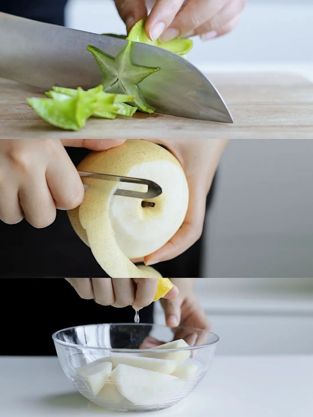 ② 梨去皮切块,挤入半颗柠檬汁防止氧化,杨桃切片,取2/3和梨一起榨汁,过滤掉果肉。