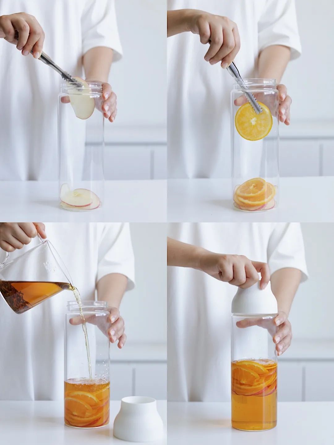 ② 4小时以后将苹果、橙子切片,放入另一个干净的壶中,倒入泡好的红茶,放入冰箱冷藏2小时以上就可以享用了 。