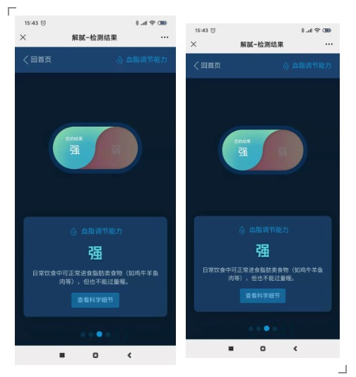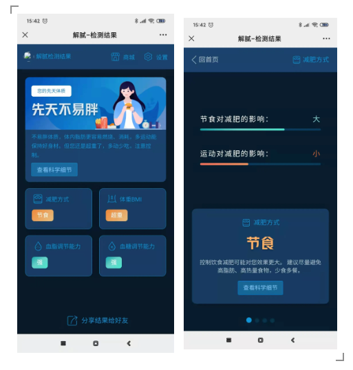 解腻能够检测人体与肥胖的相关基因位点,附加血糖调节与血脂代谢,燃脂心率,基础代谢等4项数据,结合检测结果,提供个性化减肥建议,附加华大益生菌与华大代餐食品打造健康减脂闭环。