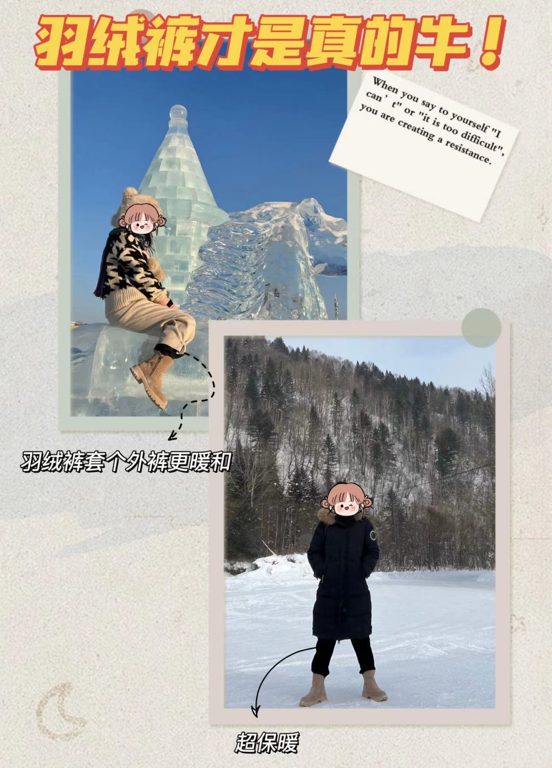 我前段时间去哈尔滨旅游就带了条羽绒裤,简直救大命了!