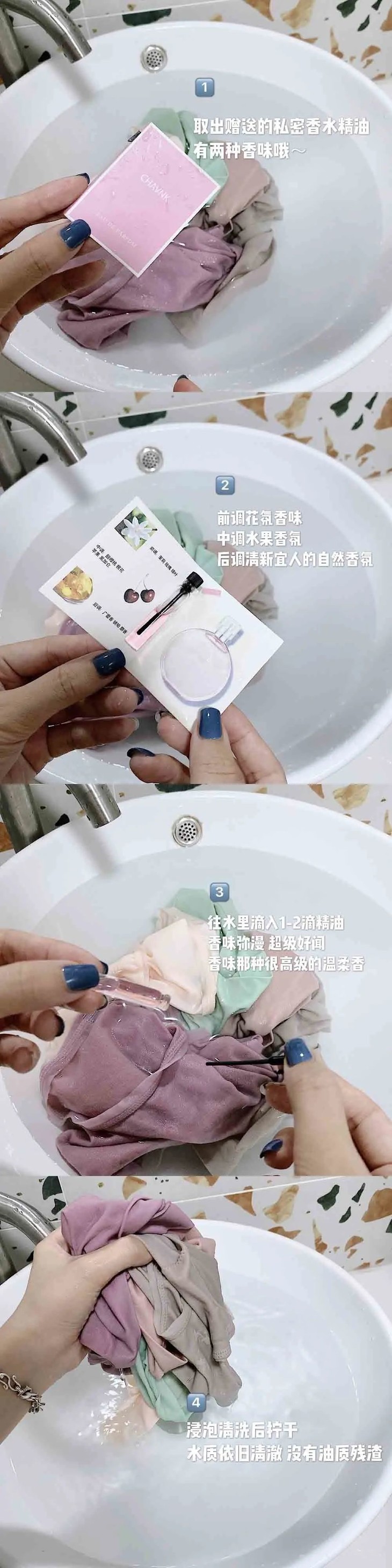 香水精油专为私密处设计,清洗内裤时撒一两滴即可,无残渣无色素,大家可以放心使用~