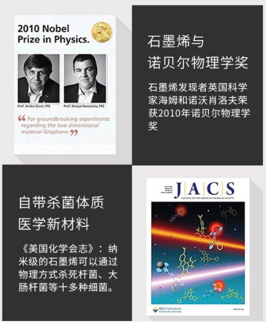 石墨烯于2010年获得诺贝尔物理学奖项,是天然的抑菌材料,能有效杀死十多种人体有害菌