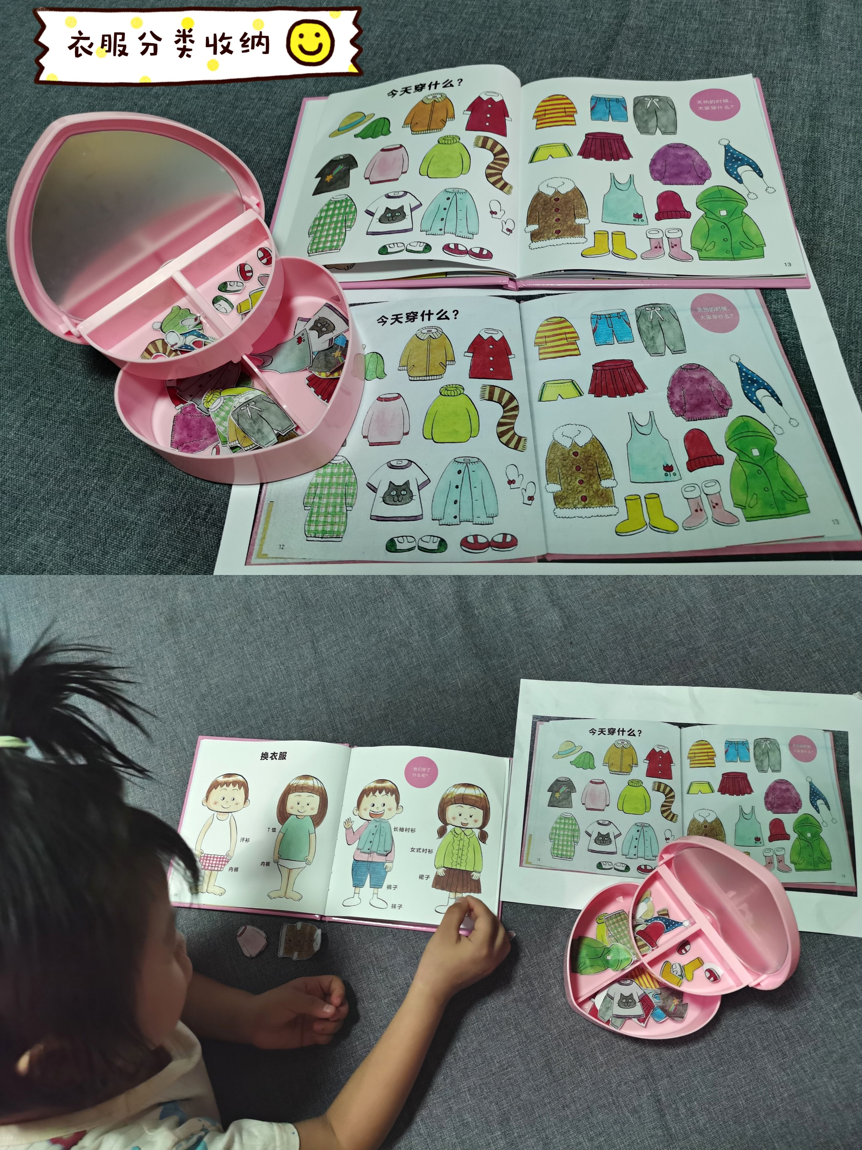 拿到新书,爱美的妹妹很喜欢看“今天穿什么?”,于是我们把服装这页打印出来并剪下来,让悦悦学着分类整理衣服,衣服有长袖短袖,有厚的薄的,有男孩女孩的 ,有鞋子帽子等,我让悦悦将衣服按冬天和夏天穿的分类收纳好。在游戏的过程中,教会孩子学会分类整理衣服,并且能够区分夏冬天穿的衣服有哪些不同。