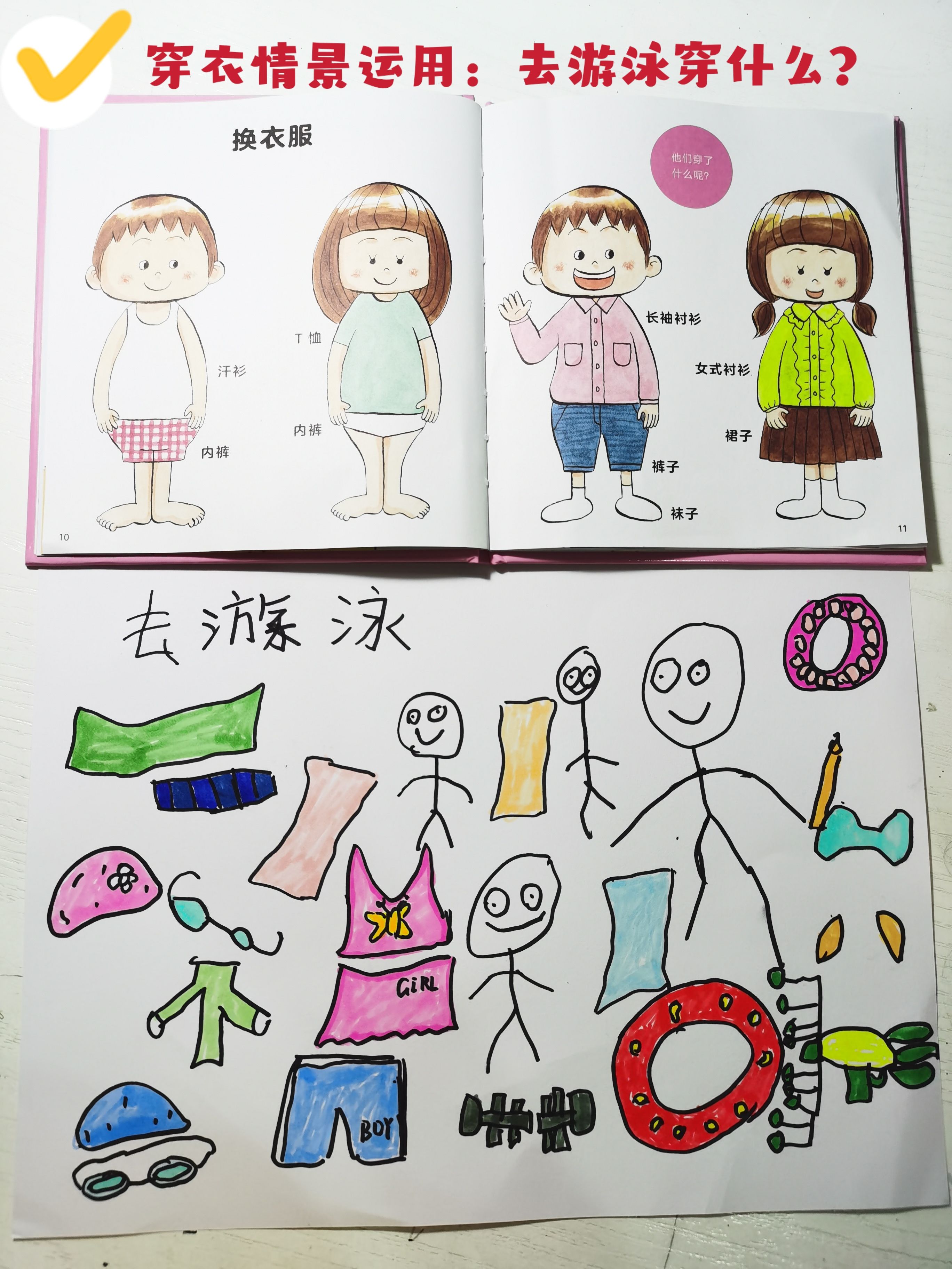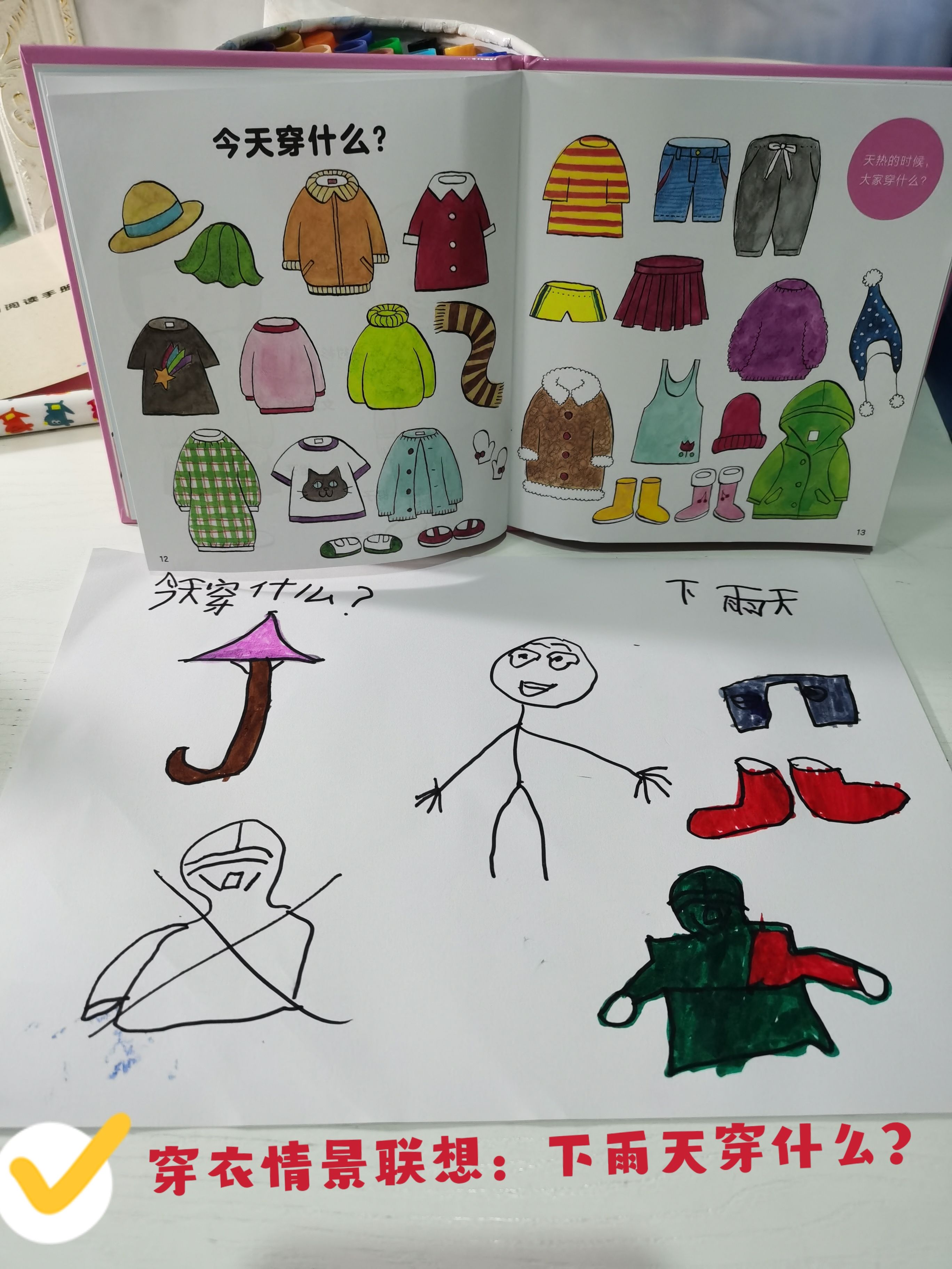 呈哥是一个脑洞大开的艺术家,每次拓展思路都让我眼前一亮,这次他自己画了下雨天和去游泳两个不同情景需要穿的衣服和配饰装备,这个玩法可以很好地训练孩子的情景想象能力及逻辑思维能力。